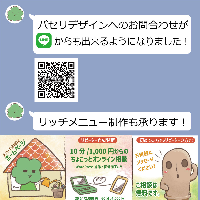 LINEリッチメニューはじめました。オンライン・対面ともに対応可能です! パセリデザイン from paseri-d.com